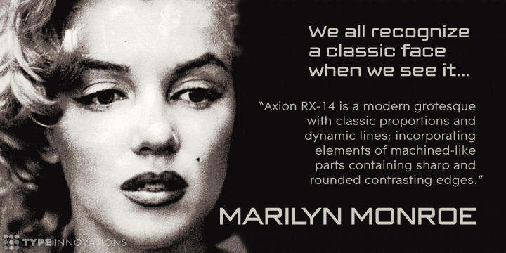 Axion RX-14 is a futuristic, techno-looking and expressive typeface with an appearance of machined parts with sharp and rounded edges. This attractive display comes in roman with lower case and lining figures. The large Pro font character set supports most Central European and many Eastern European languages.