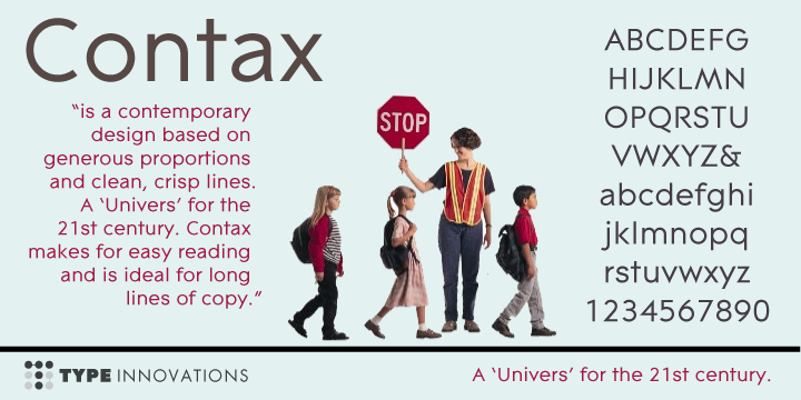 So, I rolled up my sleeves and designed a font that meet all their criteria. Contax is the new 'Univers' for the 21st century. Contax has inspired the enormously popular and expanded Contax Pro and Contax Sans family of weights and styles. Check out both Contax Pro and Contax Sans today.