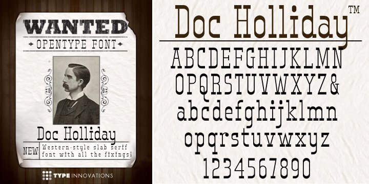 Doc Holliday has a mid-to-late 1800s wood type feel, and one can envision a sign over the O.K. Corral in Tombstone, Arizona, and the legendary Gunfight between the three Earp brothers and "Doc" Holliday and the Claytons and McLaurys.