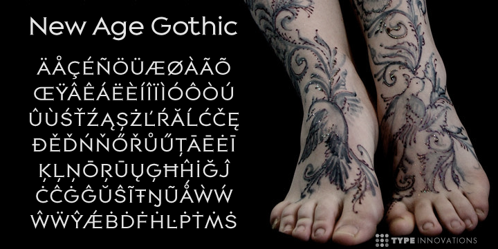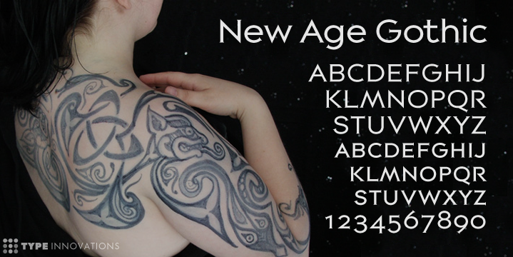 The result is a truly unique modern gothic font. Unlike other typefaces, New Age Gothic incorporates uniform stems throughout the capitals, lower case and figures. This gives the design a uniform appearance in overall color and strength. There is a perfect visual balance between inter-letter spacing, stem weights and proportions.