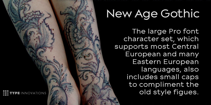 RegularNew Age Gothic is an original design by Alex Kaczun. It is a contemporary gothic design based on generous proportions and clean crisp lines. Ideally suited for easy reading and long lines of copy. The concept for the design came from a previously successful font family Contax Pro. Alex felt that the skeleton for Contax Pro was ideally suited to modify the design into a true gothic companion typeface series. Numerous modifications where made to the body proportions, stems and shapes. Serifs where added reminiscent to Copperplate Gothic to solidify the overall design.