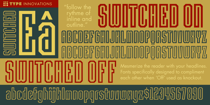 Regular"Switched Off" & "Switched On"—These two experimental fonts are Art Deco in style and are based on a square grid pattern, exploring some interesting inline and outline effects.