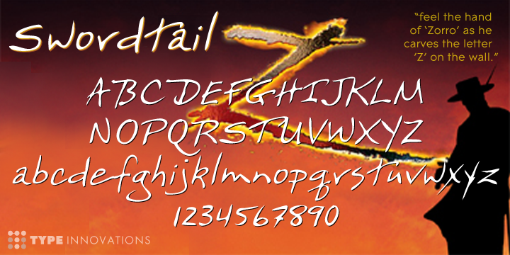 Swordtail is a freestyle script reminiscent of handwriting using a sharp instrument. You can feel the hand of “Zorro’ as he carves the letter ‘Z’ on the wall. Great for a bold display headline or expressive informal text.